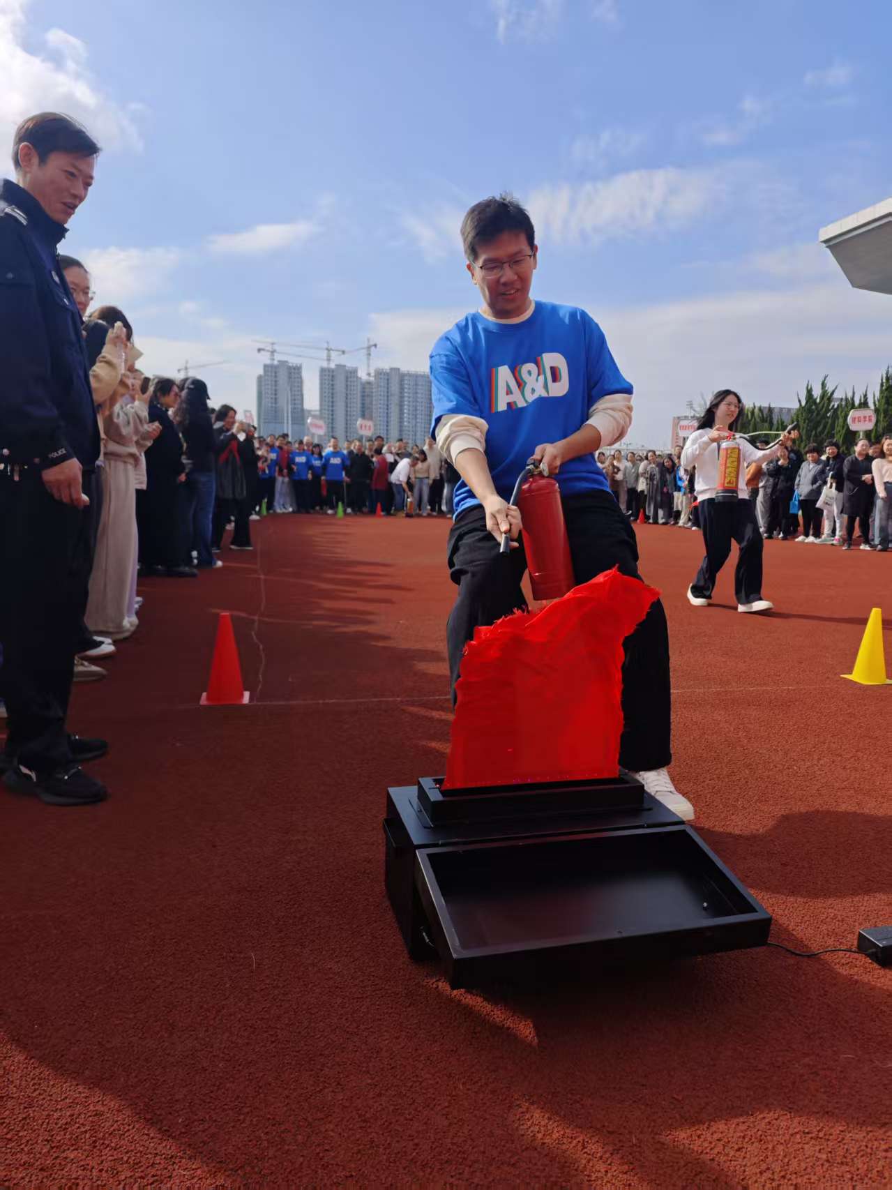 在紧张刺激的“灭火”接力中,老师们手持巨型“灭火器”模型,化身“救火勇士”,为了集体荣誉奋力冲刺,接力棒传递的是信任与速度。