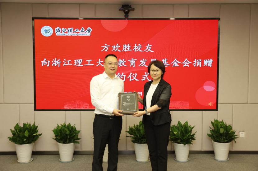 随后,姚珺代表学校与方欢胜校友签订捐赠协议书,接受方欢胜校友递交的捐赠支票,并向方欢胜校友颁发捐赠证书和捐赠铭牌。
